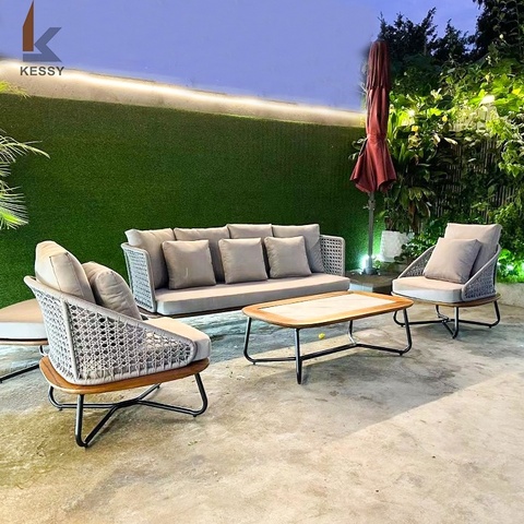 Luxe High-End Moderne Patio Lounge Sectionele Bank Teak Hout Touw Geweven Waterdichte Hotel Tuinmeubelen Sofa Sets